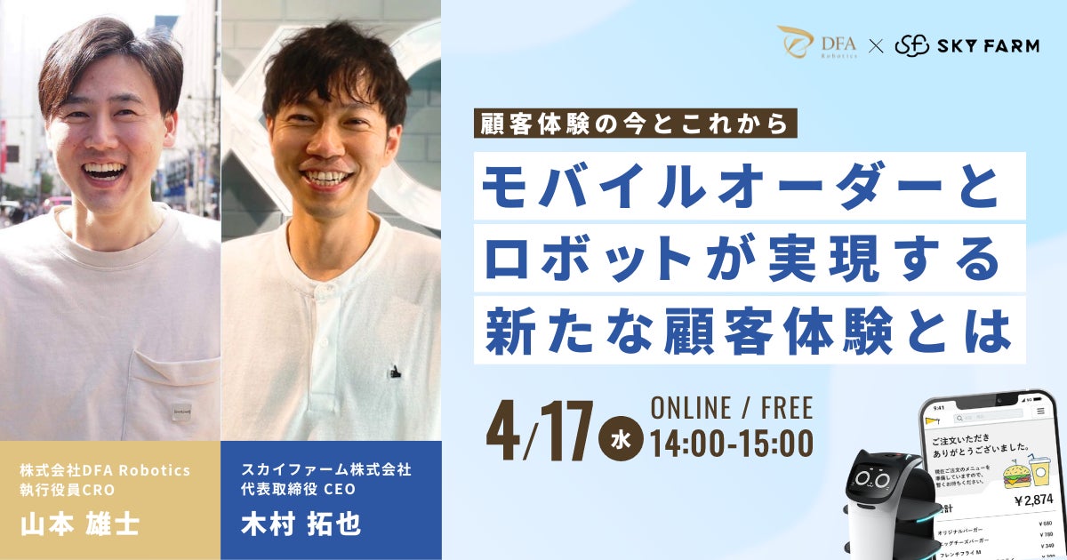 DXを推進するロボティクスソリューションカンパニーである株式会社DFA Robotics(本社:東京都渋谷区、代表取締役社長:波多野昌昭、以下「DFA Robotics」)と、施設特化型モバイルオーダーシステム「NEW PORT」を運営するスカイファーム株式会社(本社:神奈川県横浜市 代表取締役 CEO:木村 拓也)は、商業施設やホテル向けに人手不足と顧客体験を向上させるDX施策について、2024年4月17日(水)14:00から参加無料の共催ウェビナーを開催いたします。