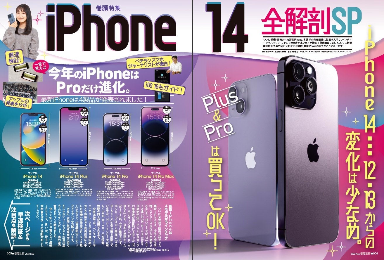 ついに全世界で販売が始まった最新iPhone。今年も昨年同様、2シリーズ4モデルが発表されました。ベンチマークやバッテリー、さらに注目度の高いカメラ性能などを、発売直後に入手した実機(未発売のPlusを除く)でテスト。注目機能「ダイナミックアイランド」も試しています。さらに、実際に現地発表会に行ったスマホジャーナリストにもインタビューし、専門家の意見をじっくり聞きました。決して安いとは言えない最新iPhone。買いか、待ちか。本特集をぜひ、その判断材料にしてください。