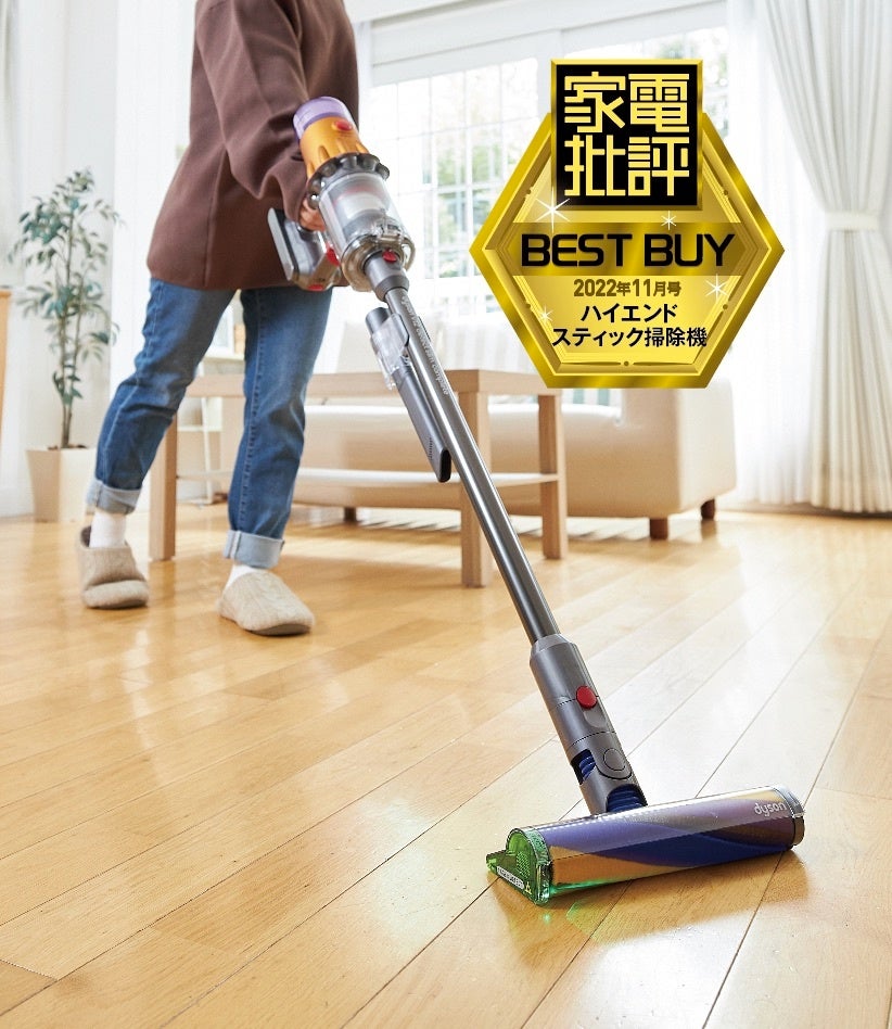 明かりを照らすだけでなく床のゴミがしっかりと見える「Laser Slim Fluffyクリーナーヘッド」、くし型ブレードで毛絡みを防止する「Motorbarクリーナーヘッド」の2つのメインヘッドの使い分けで、高い吸引力を見せたのが本製品。吸引性能テストは35点中34点とほぼパーフェクトでした。