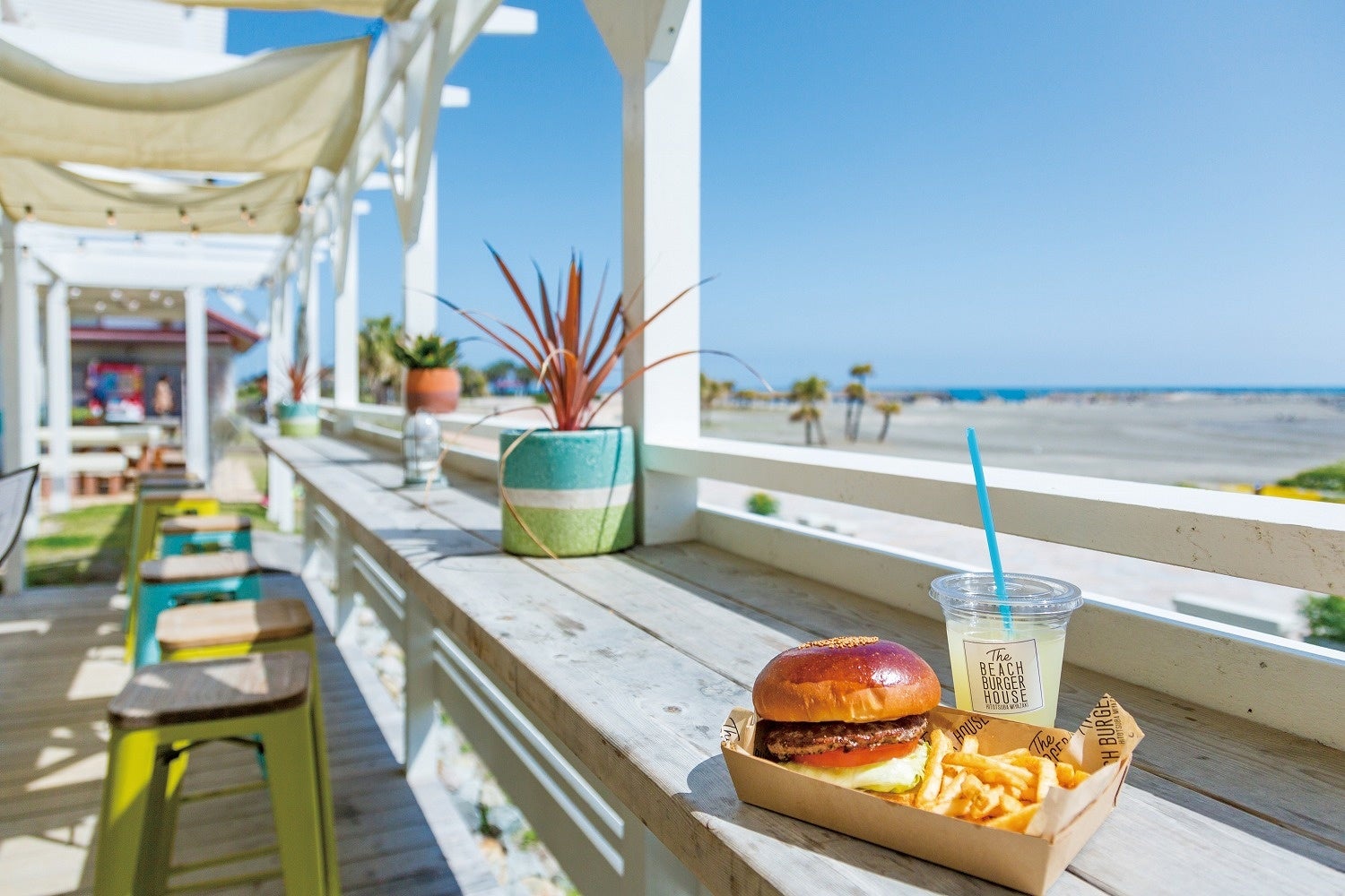 第一弾のスプリングバーガーは「アスパラエッグチーズバーガー」。シャキシャキの食感が楽しい旬のアスパラガスを素揚げにし、モッツァレラチーズ、とろ~り目玉焼きとともに、あら挽き牛肉100%のジューシーなパテにトッピング。もちもちバンズとの一体感をお楽しみいただけます。カウンターやソファのあるテラス席で目の前に広がる青い空と海を眺めながら、海外リゾート気分を満喫ください。