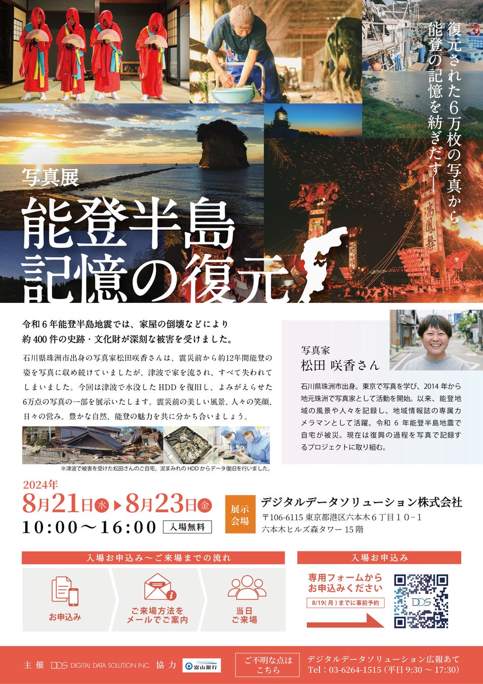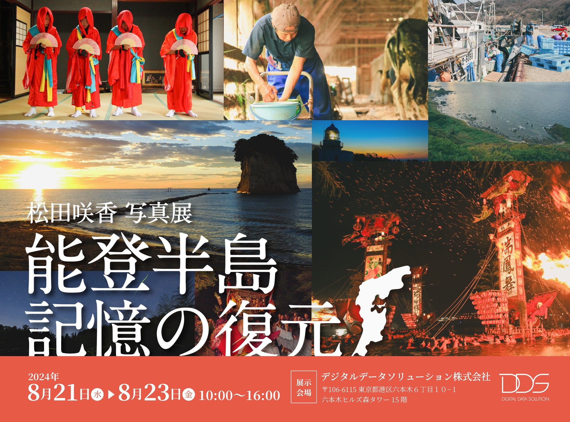 デジタルデータソリューション株式会社(本社:東京都港区、代表取締役社長:熊谷 聖司、以下デジタルデータソリューション)は、2024年8月21日~8月23日の3日間、当社オフィス(六本木ヒルズ森タワー15階)にて、写真家松田咲香さんの写真展「能登半島 記憶の復元」を開催します。