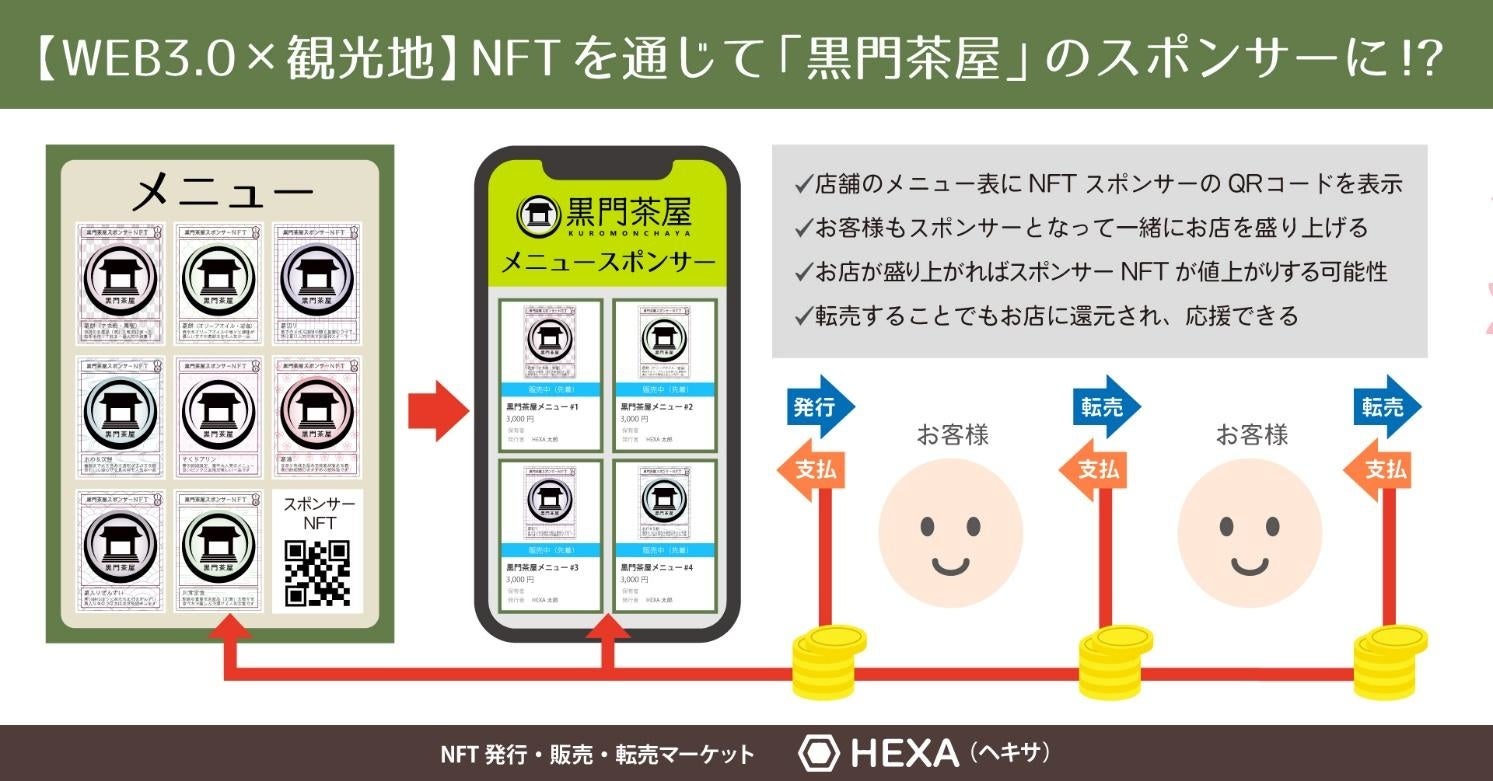 そこで当社は、NFTマーケットプレイス「HEXA(ヘキサ)」を運営するメディアエクイティ社と協働し、飲食店と支援者のつながりを新しく構築することで飲食店の継続・発展を後押しするプロジェクトを始動いたしました。