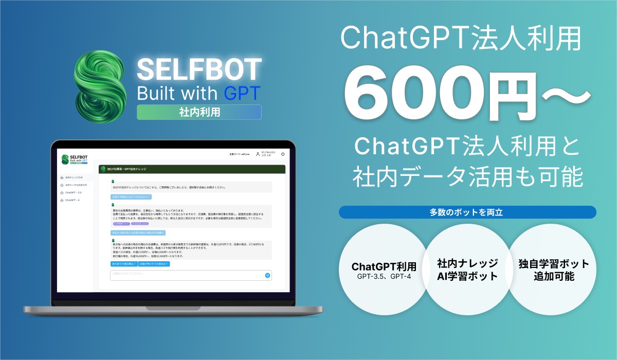 ChatGPTの法人利用「SELFBOT社内利用」が600円〜利用可能に。社内ドキュメント学習機能と併用利用を実現。