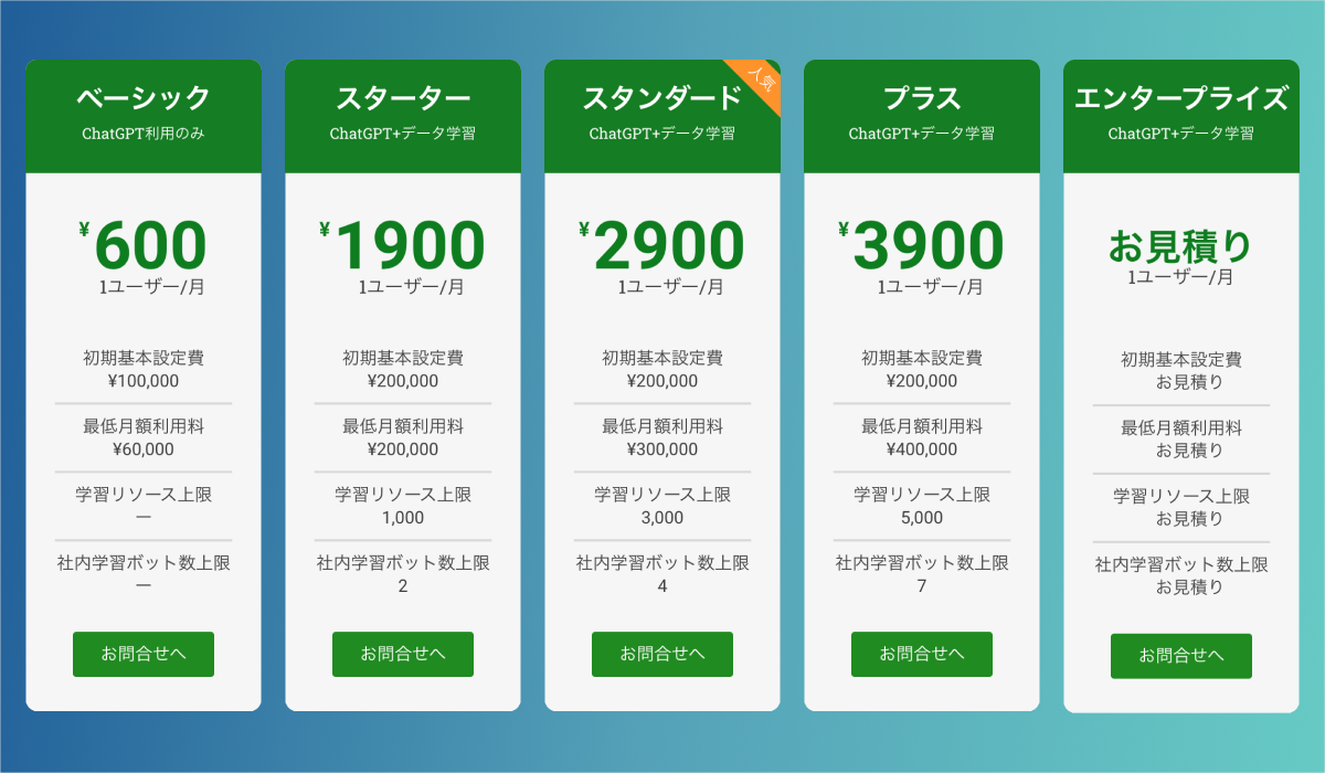 社内ドキュメント、ナレッジ学習機能においては、1900円からのプランになります。