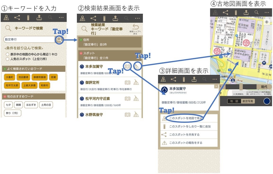 株式会社ビーマップ(本社:東京都千代田区、代表取締役社長:杉野 文則)、有限会社菁映社(東京都豊島区/代表者:籏禮 直喜)、株式会社フジテレビジョン(東京都港区/代表者:港 浩一)から構成される大江戸今昔めぐり製作委員会が提供するスマートフォン向け古地図アプリ「大江戸今昔めぐり」(以下、本アプリ) は、7月24日(月)より人物名・スポット名検索機能をさらに強化・拡大いたしました。「大江戸今昔めぐりは」本年2月にも人物名の検索を大幅に強化しており、これに続く今回の人物名・スポット名の検索機能強化で、古地図に記載された多くの情報を、さらに詳細かつお手軽にご活用いただけるようになります。