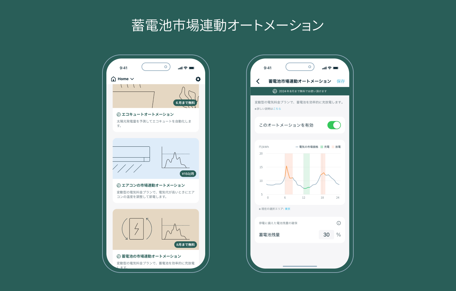 「Nature Green」の有料オプション「蓄電池市場連動オートメーション」は、「Nature Remo E」で市場価格に連動して家庭用蓄電池を最適に自動制御する機能です。スマートメーターから取得した過去の消費電力量を基に当日の消費電力量を予測し、自身で選択・設定した電力エリアの市場価格が低い時間帯に蓄電池を充電、高い時間帯に蓄電池から放電することで、効率的に電気料金を抑えます。太陽光発電設備を設置しているご家庭の場合は、過去の太陽光による発電量と天気予報を考慮に入れて消費電力量を予測します。また、停電時に備えた蓄電池残量の確保の設定や市場価格のグラフ表示も可能です。「蓄電池市場連動オートメーション」はリリースを記念して2024年8月末日まで無料でお試しいただけます。