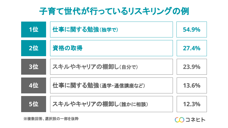子育て世代にどのようなリスキリングをしているか聞いたところ、54.9%が「独学で仕事に関する勉強をしている」と回答。次いで27.4%が「資格取得」と答えています。「育休中に副業をしてスキルアップを図っている」(30代女性、育休中フルタイム社員、末子1歳)など、副業によってスキルと収入を増やそうとしている人も見られました。