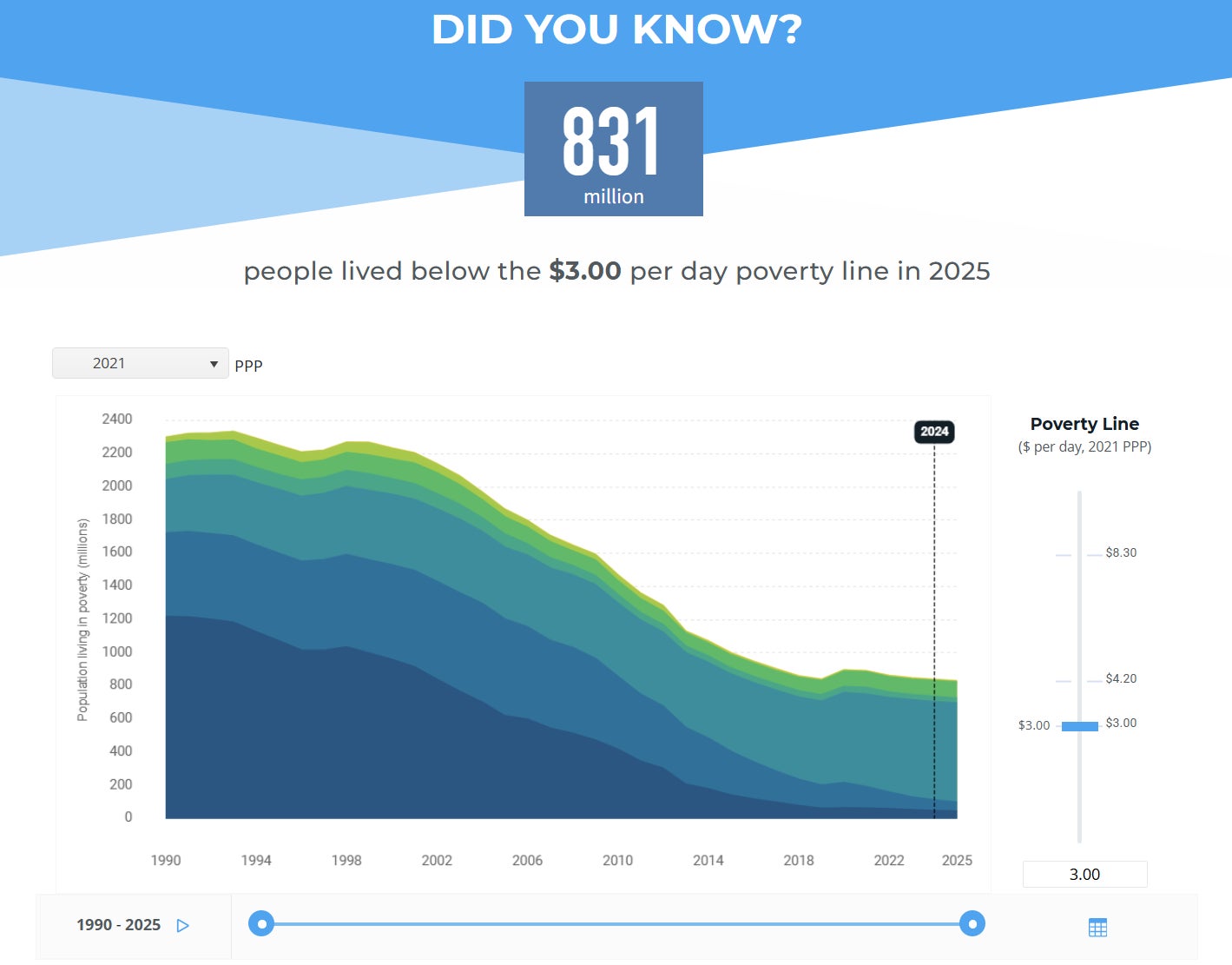 世界銀行は2025年6月の推計で、世界人口の約9.9%(8億800万人)が極度の貧困下にあると報告しました。国際貧困ラインは1日3.00ドル(2021年購買力平価)に引き上げられており、従来より多くの人々が貧困層に分類されています。