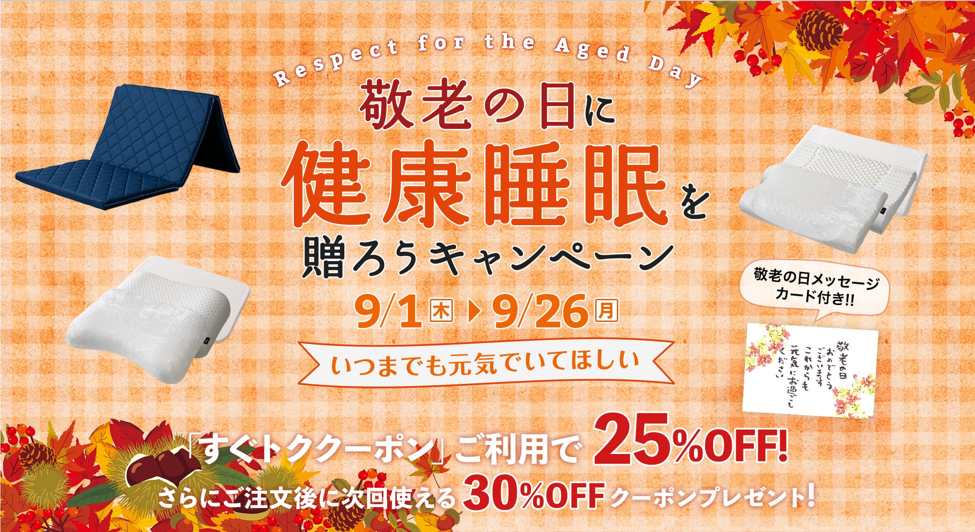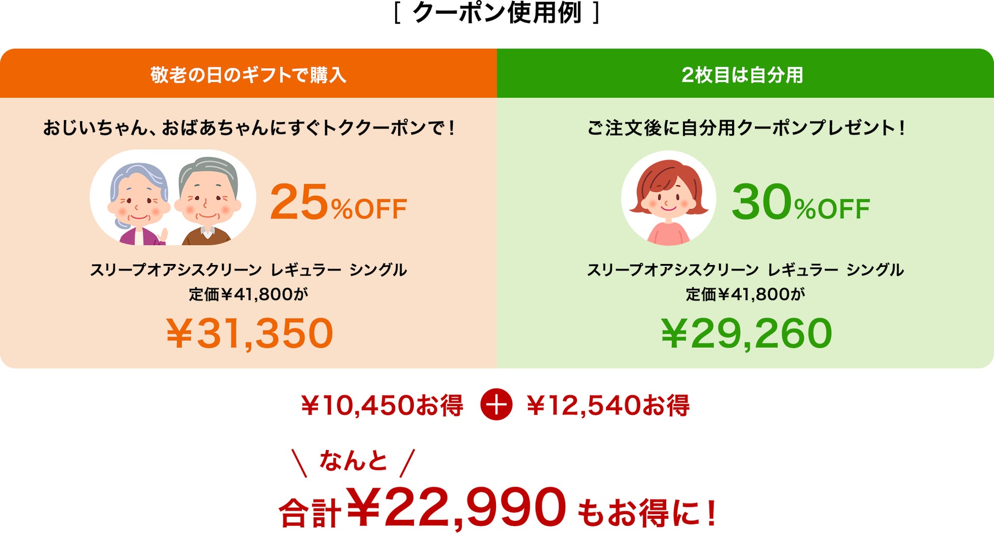 すぐトククーポンで25%OFFになるほか、贈り主様の健康睡眠のためにもお得な特典をご用意、合計でなんと、¥22,990もお得にお買い物ができます。