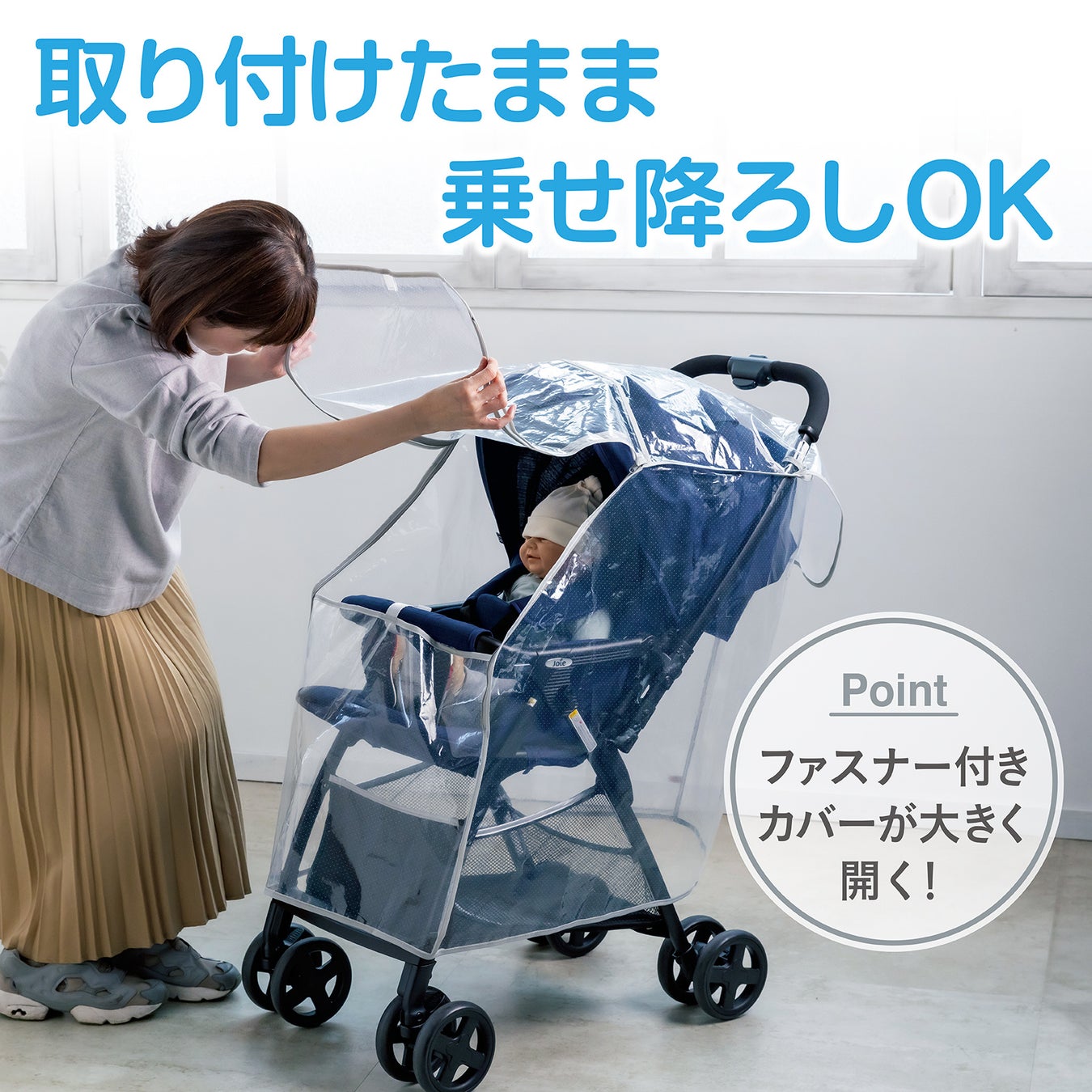 ファスナーで大きく開く窓が前面にあるので、取り付けたままで赤ちゃんの乗せ降ろしができます。変わりやすい天気の日でも着脱不要の便利なレインカバーです。取り外した時に便利な専用収納ポーチが付属しています。