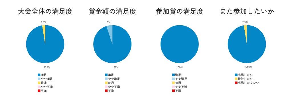 今回、大会当日に出場選手へのアンケートを実施いたしました。大会全体の満足度としては、97.5%が「満足」、2.5%が「普通」と回答しています。賞金額の満足度については「満足」と回答した選手が95%、「やや満足」と回答した選手が5%、スポンサー提供の参加賞については全員が「満足」との回答でした。「今後も参加したいか」という問いに対しては、97.5%の選手が「出場したい」と回答しています。