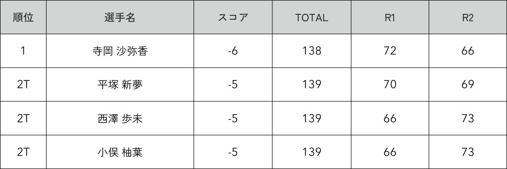 初日第1ラウンドでは、ルーキー小俣 柚葉プロ・西澤 歩未プロが6アンダーで首位発進。西澤プロは2日目最終18番ホールまで首位を維持しますが、17番・18番ホールでボギーとなり2位タイ。前半から安定感を発揮した寺岡 沙弥香プロが、ボギーフリーの6バーディで大逆転勝利をおさめました。当社所属・ホステスプロの永嶋 花音プロはトータル1アンダー・17位タイ。昨年優勝の須江 唯加プロはトータル2オーバー・27位タイとなりました。