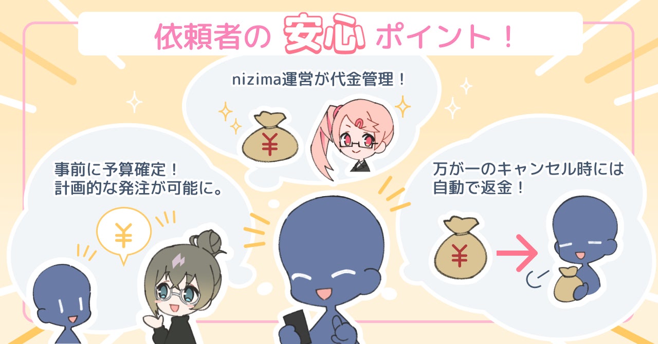 ※お支払い後の代金はnizima運営事務局が一時的にお預かりし、納品が完了となれば依頼先となるクリエイターへ売上が計上される仕組みとなります。