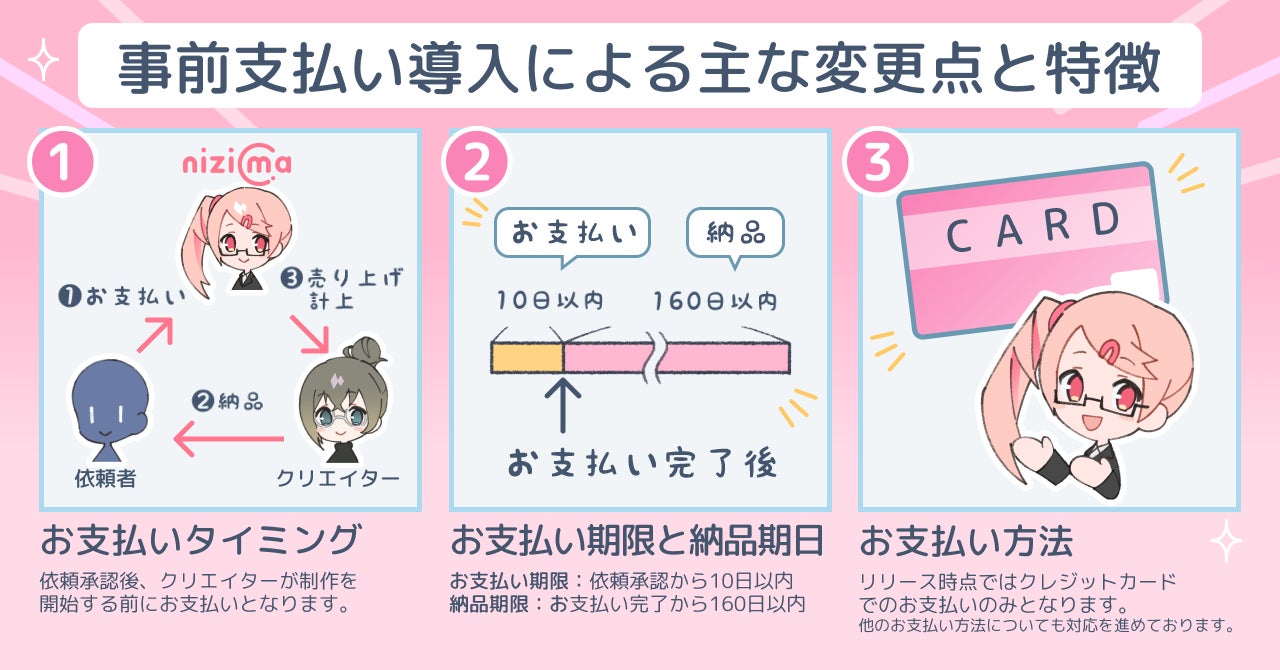 nizimaのオーダーメイド取引では、これまで作品納品後に支払いを行う方式を採用していましたが、クリエイター様より「制作開始前に支払いを確保したい」とのご要望を多数いただいておりました。