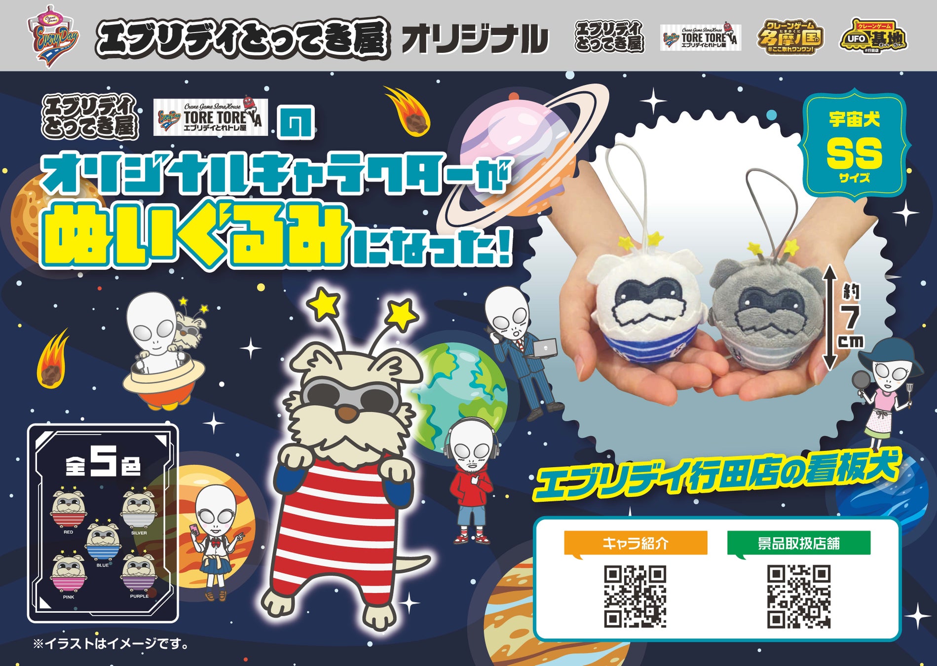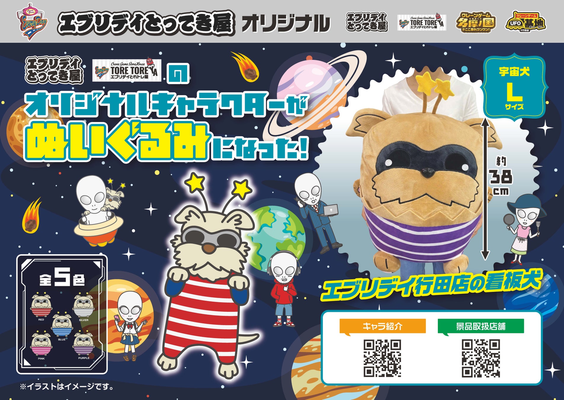 オリジナル景品第6弾として登場するのは、2012年にクレーンゲーム設置台数で世界一になった元祖世界一のクレーンゲームセンターエブリデイ行田店のマスコットキャラクター「宇宙犬」です。