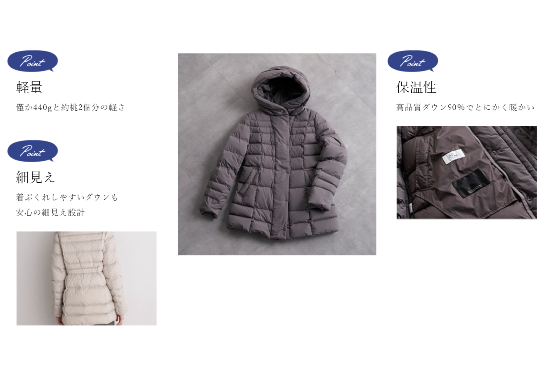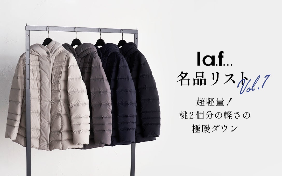 トレンドに流されないシンプルベーシックなスタイルを提案している「la.f...(ラ・エフ)」から、超軽量!桃2個分の軽さの極暖ダウン登場!