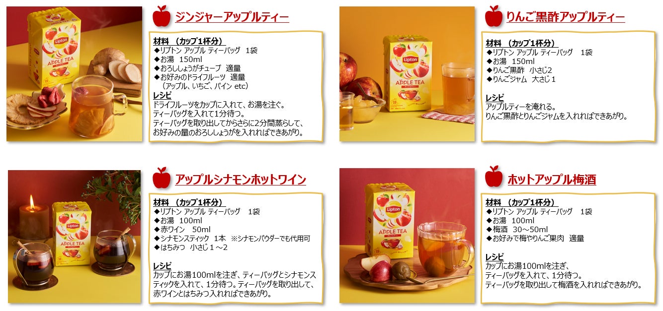 今まで以上に果実感がアップした「リプトン フレーバーティー」シリーズは、楽しめるアレンジの幅もより広がりました。特に「リプトン アップル ティーバッグ」は、お酢や豆乳だけでなく、ワインや梅酒などのアルコールとも相性抜群。自分の好みに合わせた自由なアイデアをぜひお試しください。