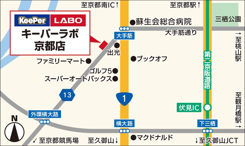 「KeePer LABO 京都店」は、名神高速道路 京都南インターから国道1号線を2.2キロ南下した『大手筋交差点』を右に入ってすぐに位置した店舗で、前面道路の交通量も多く、初出店の地となりますが、早い認知が期待できそうです。直営店として93店舗目の店舗となります。
