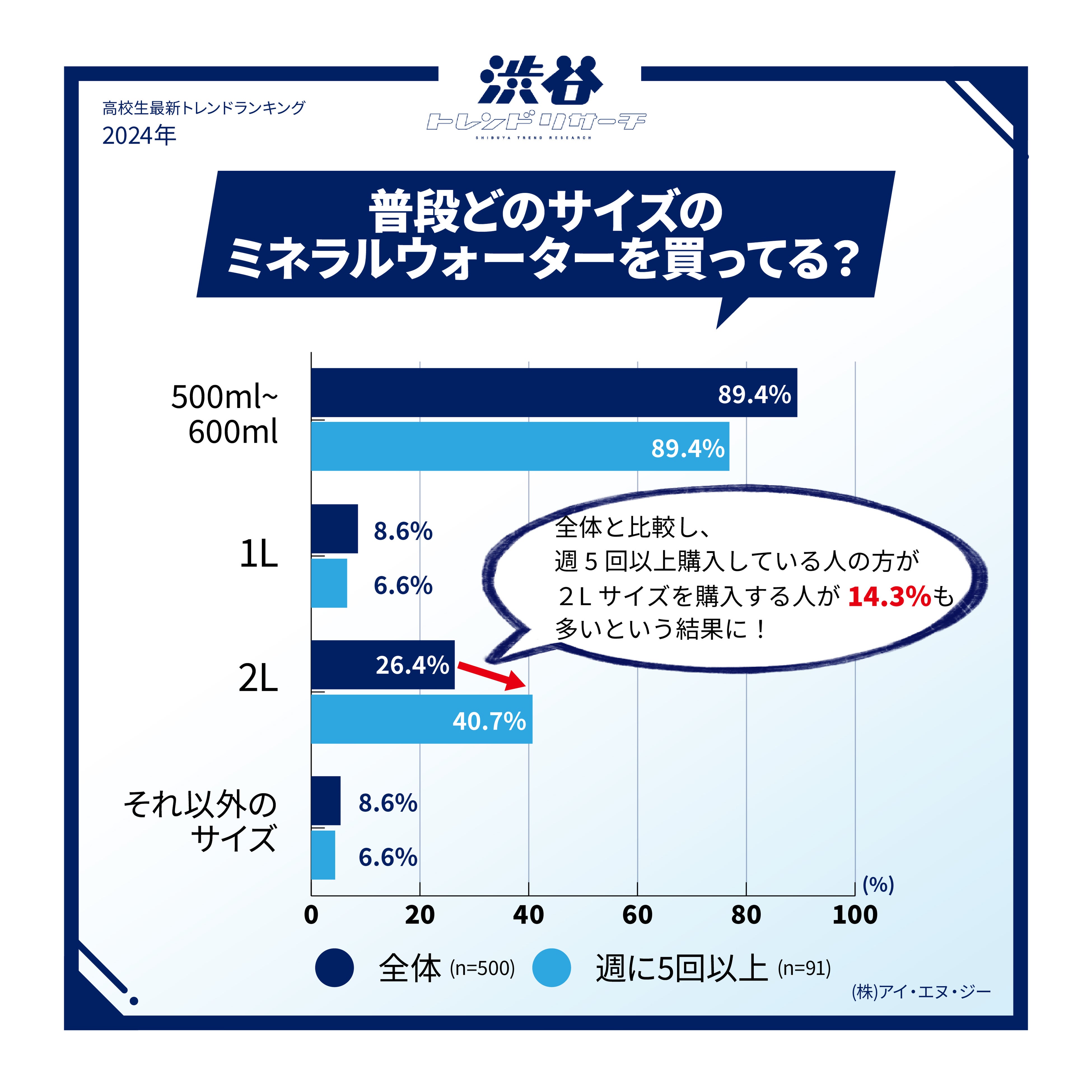 また、週5回以上ミネラルウォーターを飲用している人は1L以上を飲む人が全体に比べ約20ポイント増加しており、購入サイズも2Lを購入している人も増える結果となりました。