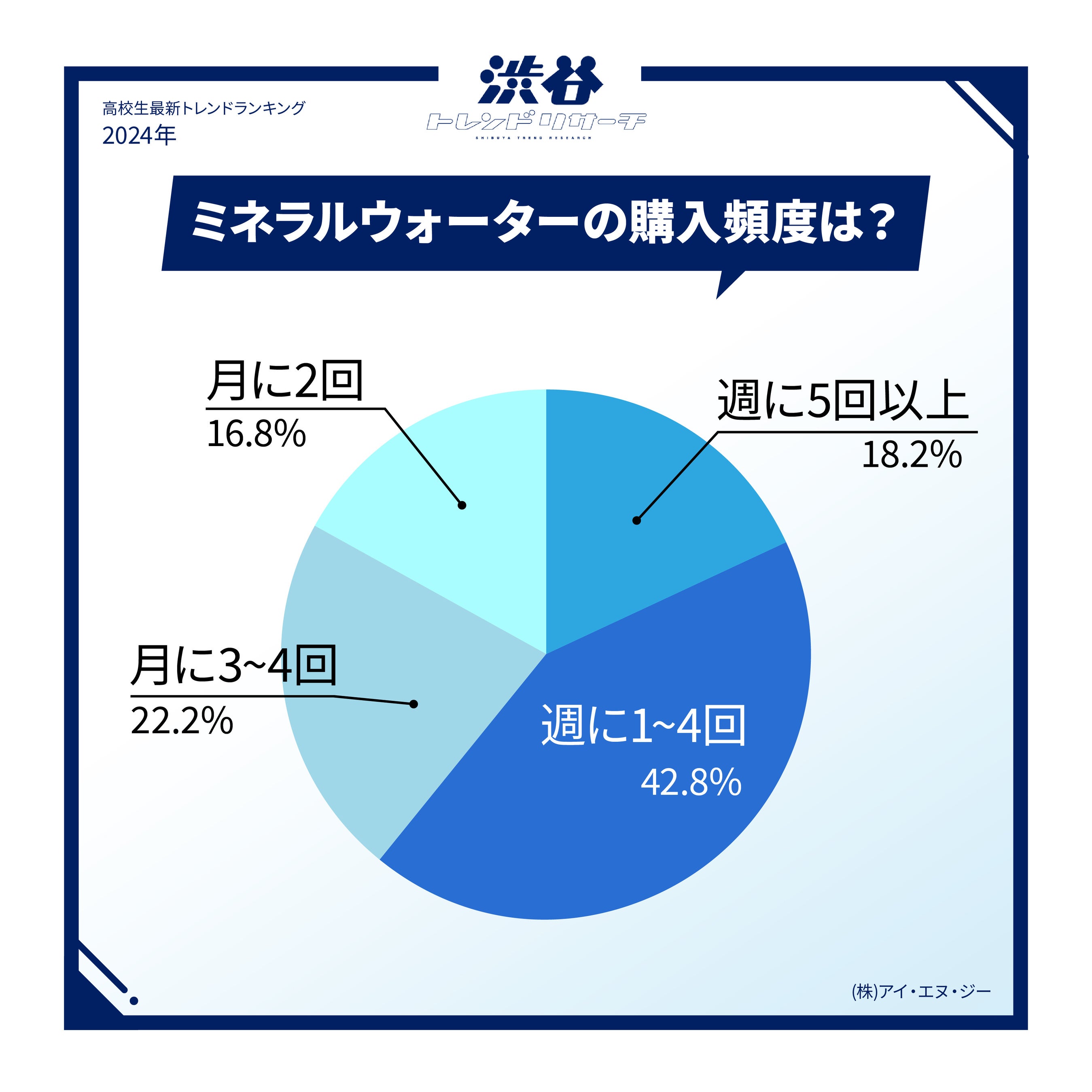 ミネラルウォーターにおける飲用頻度は週1回以上が最も多く、週5回以上飲む水好きの学生も約2割いる結果となりました。