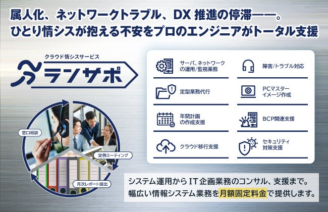 クラウド情シスサービス「ランサポ」は、お客様の情報システム業務全般を月額固定料金でトータルサポ―トするサービスです。システム運用やトラブル対応はもちろん、BCP関連支援やセキュリティ対策といったIT企画業務のコンサル・支援までを経験豊富なエンジニアがサポートします。