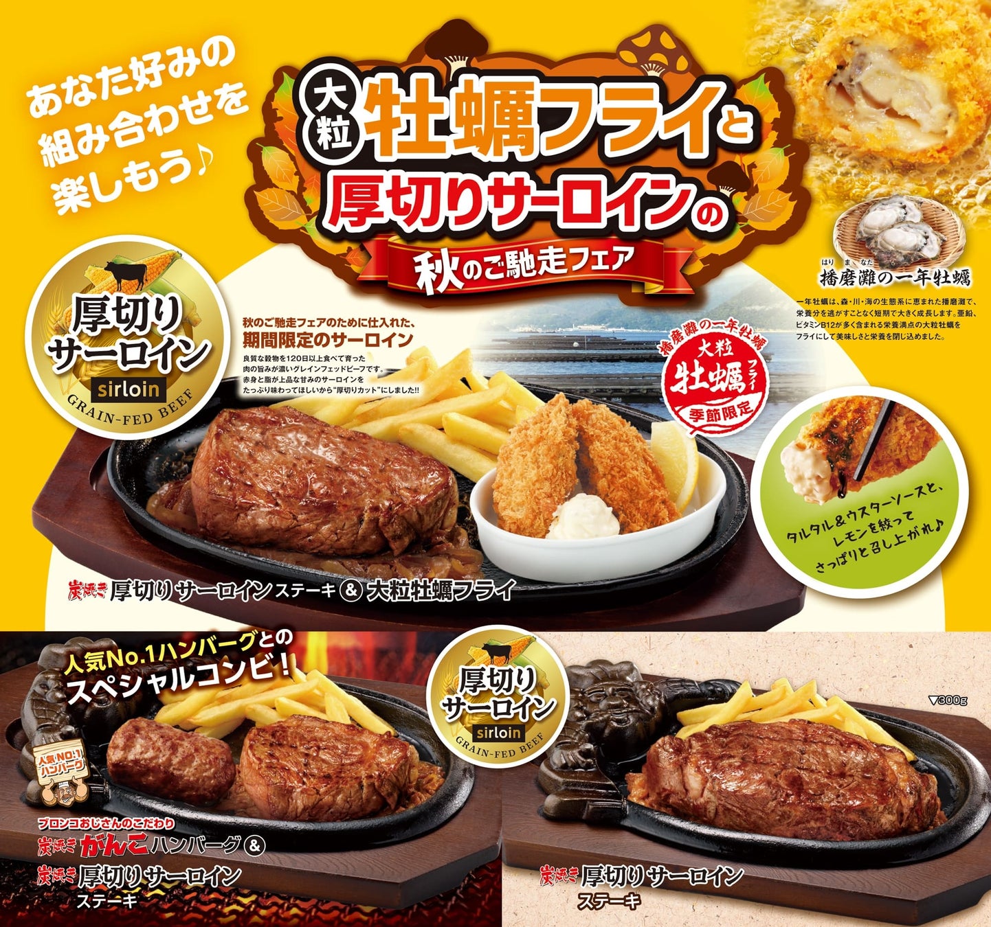 ステーキハウス ブロンコビリーから、食欲全開の秋のご褒美メニュー『大粒牡蠣フライと厚切りサーロインの秋のご馳走フェア』を10月6日(金)より期間限定で開催