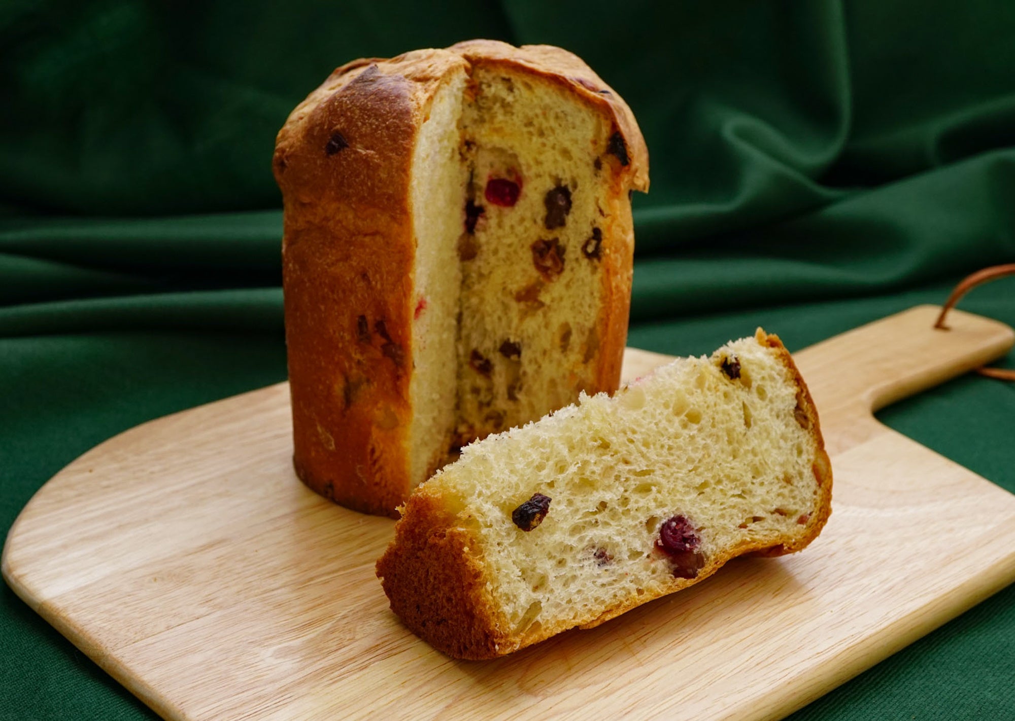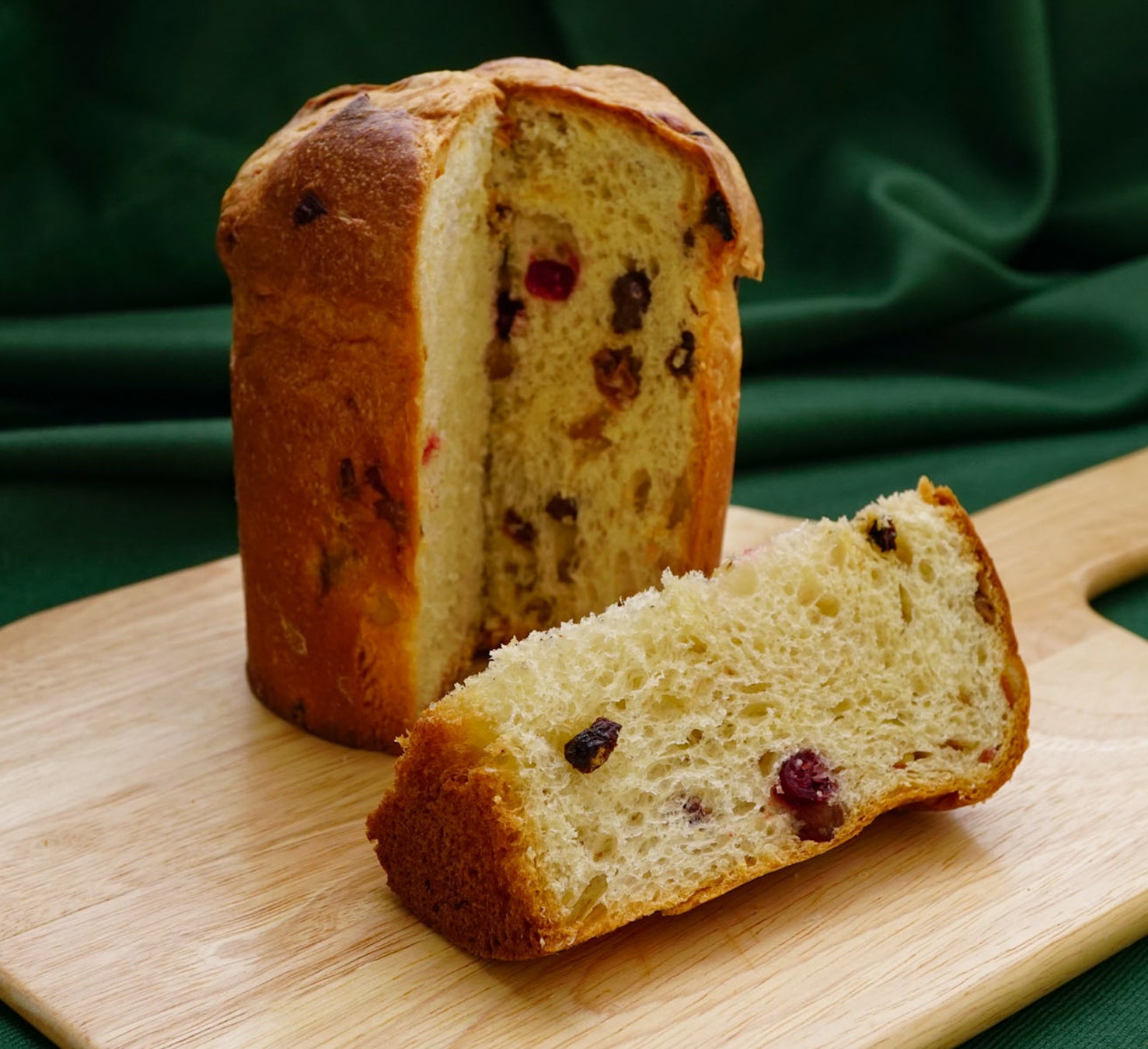 2022年の発売以来毎年ご好評をいただいているパネトーネは、イタリアの伝統的な菓子パンの一つで大きなドーム型のフォルムが特徴です。ラム酒に漬け込んだ5種類のドライフルーツを贅沢に練り込み、長時間発酵させた自家製のパネトーネ生地をしっとりと焼き上げました。長時間の発酵によって生まれる自然な甘みと香ばしさが特長です。カットするたびにふんわりと広がるドライフルーツの香りと、軽やかで口溶けのよい生地が調和し、朝食やティータイムにもぴったり。クリスマスを待ちながら楽しんでいただきたい、季節限定の味わいです。