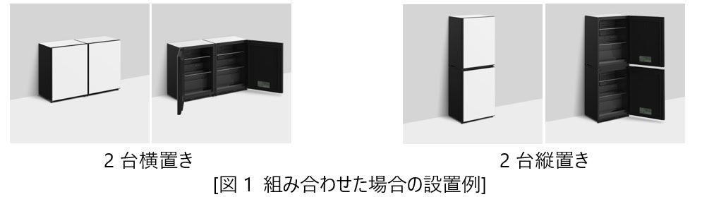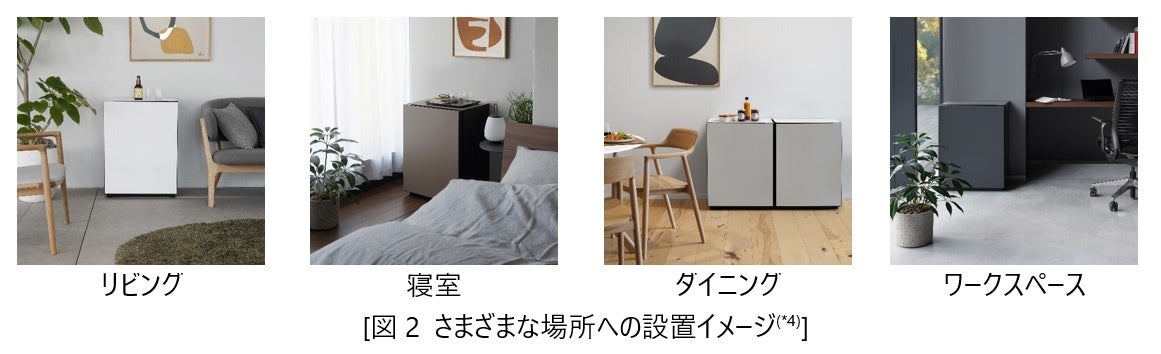 本製品は、家具に合わせやすい奥行420mmにするとともに、背面を壁にぴったりとつけて設置(*1)でき、リビング、寝室、ダイニング、ワークスペースなど、さまざまな場所に置きやすい仕様としています。また、2台を組み合わせて横置き(*2)や縦置き(*3)ができます(図1)。これらにより、置きたい場所や使い方に合わせて、お好みのスタイルを実現できます(図2)。