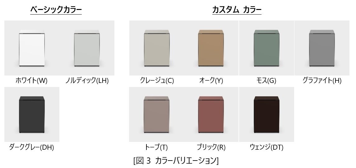 インテリアショップのACTUS(アクタス)とのコラボレーションによるインテリアとの相性を考えた10色のカラーバリエーションを展開します(図3)。中間色といわれるグレーカラーのバリエーションを中心に構成し、ドアの表面にはマットな質感の樹脂を採用することで、その繊細な色合いを表現しました。インテリアの色や素材の間をとって全体をまとめるので、リビングや寝室などさまざまな空間に合わせやすくインテリアの個性に合わせてコーディネートできます。