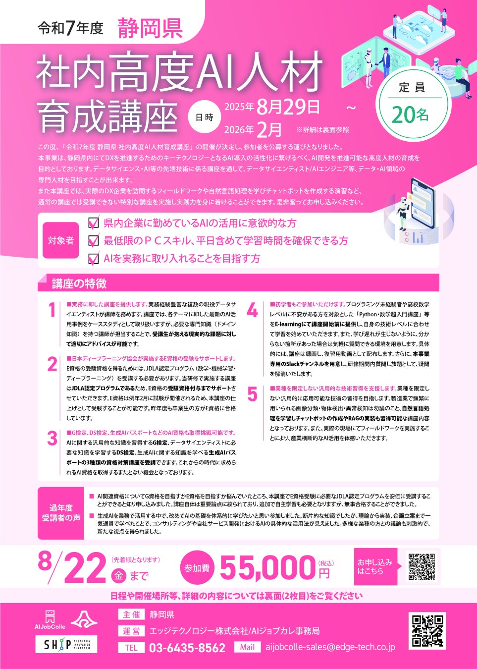 エッジテクノロジー株式会社は静岡県の委託を受け、AIを導入するための実践的なスキルを身に着けられる「社内高度AI人材育成講座」を開催します。