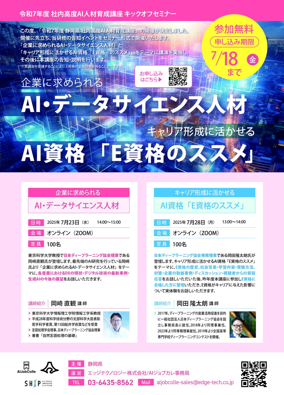 また、これに先立ち、静岡県内の企業にお勤めの方を対象に「企業に求められるAI・データサイエンス人材」(東京科学大学情報理工学院情報工学系教授:岡崎直観氏)と「キャリア形成に活かせるAI資格E資格のススメ」(日本ディープラーニング協会専務理事:岡田隆太朗氏)と題した2つのオンラインセミナーを無料でご提供します。