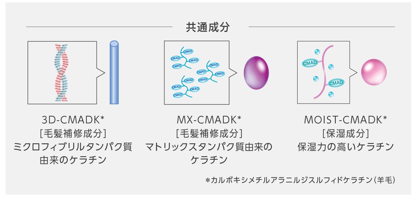 縮み崩れた内部構造を3種のCMADK*で補修し、毛髪形状を整えることで、髪全体を美しいフォルムへと導きます。