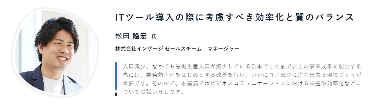 講演概要: ITツール導入の際に考慮すべき“効率化”と“質”のバランスについてお話をさせていただきます。また、業務効率化の必要性やツール導入をする際に注意すべきポイントについてもお話いたします。