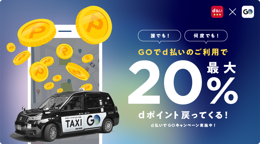 期間中、『GO』の決済手段を『d払い』に設定し『GO Pay』のご利用で何度でも20%分のdポイントが還元※2されます。タクシー注文はもちろん、道や乗り場など流しでの『GO Pay』ご利用も対象となります。この機会にぜひご利用ください。