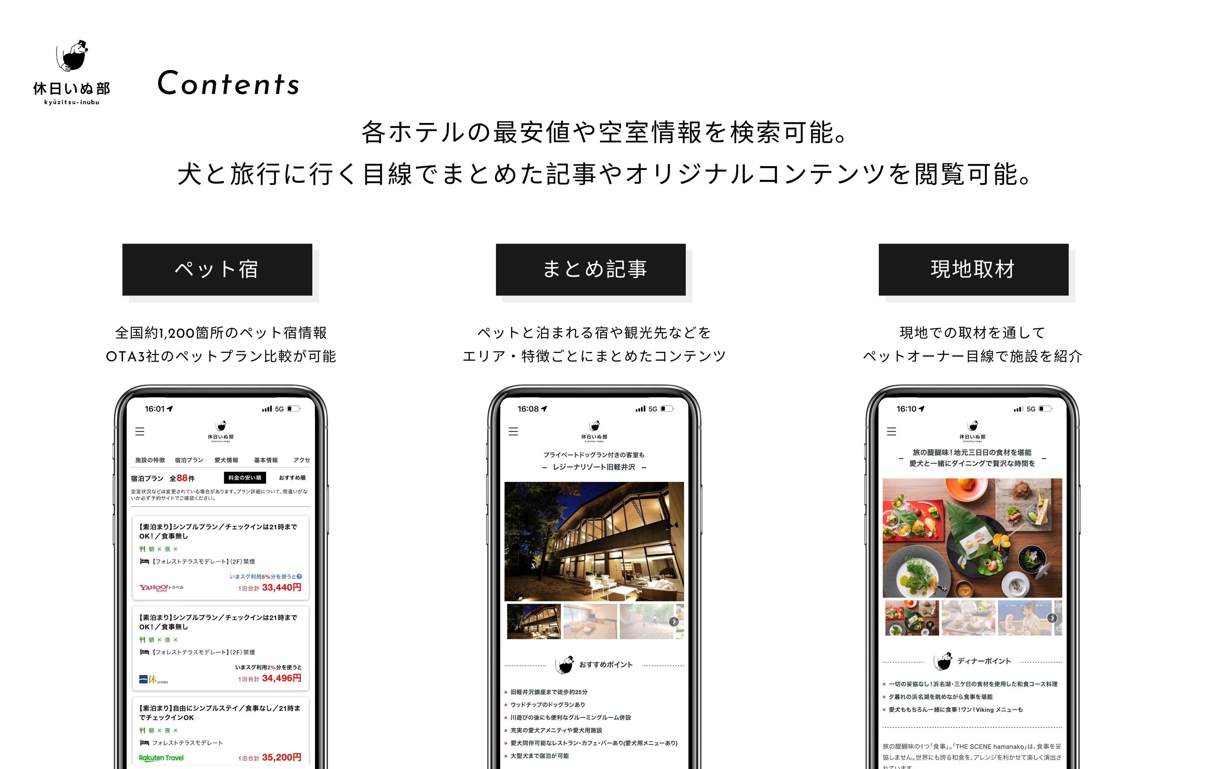 「休日いぬ部」は、「愛犬との休日を豊かに楽しく」をコンセプトに、ペットと泊まれる宿や旅行先情報を発信するペット旅行専門メディアです。ペットと同伴できるホテル・旅館・旅先のみをコンテンツとして扱っており、エリアごとの特集から温泉、露天風呂付きなど施設タイプごとの特集、現地取材記事など、ペット旅行に役立つ情報を発信しております。通常のOTAサイトでは提供しにくい「犬種別」「頭数」「施設の特徴」といった、一般旅行サイトやメディアでは届けにくい、飼い主目線から生成されたコンテンツを通してユーザーから高い支持を得ています。