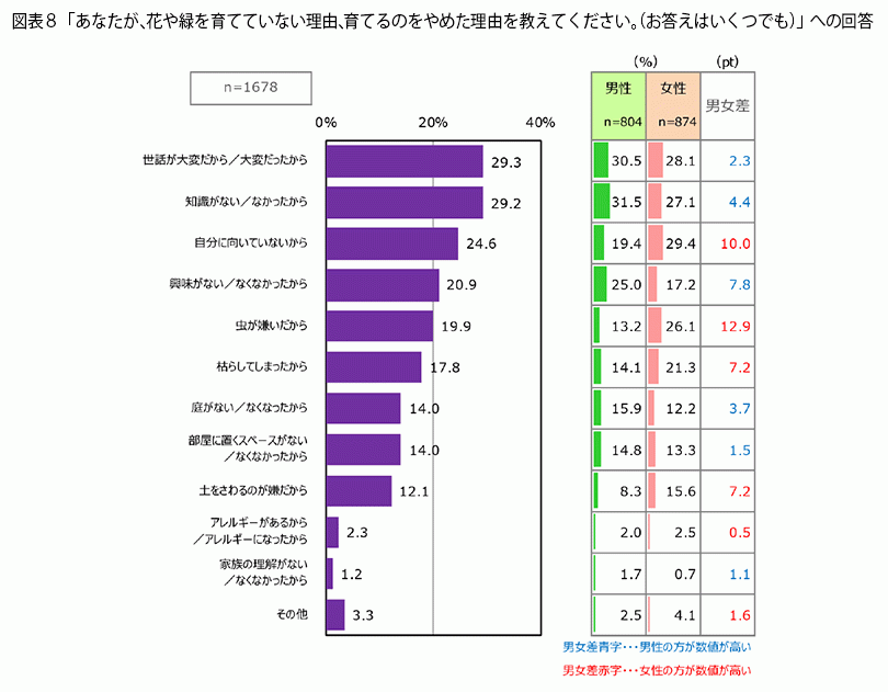 男女を比較したとき、最もポイント差があったのは「虫が嫌いだから」(男性:13.2%、女性:26.1%)です。「土をさわるのが嫌だから」(男性:8.3%、女性:15.6%)も女性のほうが割合が高いのですが、ほかにも「自分に向いていないから」(男性:19.4%、女性:29.4%)、「枯らしてしまったから」(男性:14.1%、女性:21.3%)という項目でも女性が男性を上回っています。育成がうまくいかなかったとき、女性のほうがストレスを感じやすいのでしょうか。