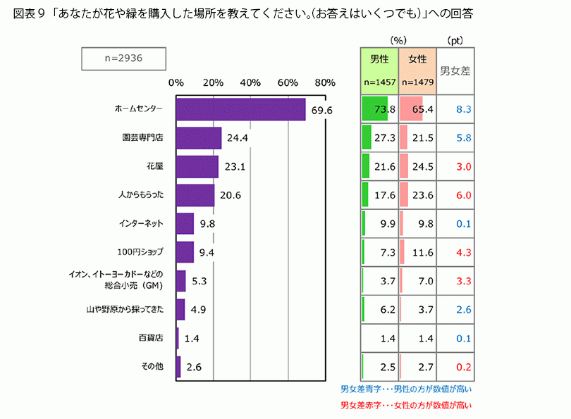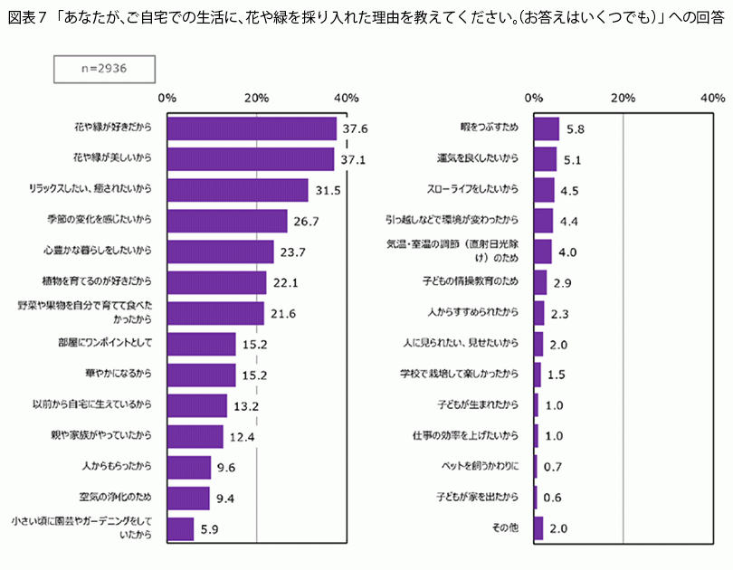 「人からもらった」という人も20.6%いますが、「花や緑を採り入れた理由」(図表7)においては、「人からもらった」と回答していた人は9.6%と低い数値でした。両者にギャップがあることから、もともと花や緑を育てている人は、もらったものを育てることがあるが、人からもらったことをきっかけに育て始める人は少ない、ということが予想されます。