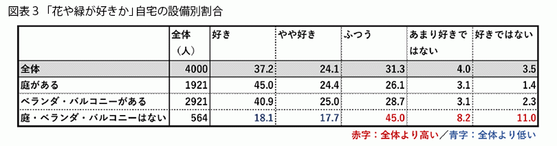 また、自宅に庭、ベランダ・バルコニーがあるかどうかを聞きました(図表2)。自宅にある設備と花や緑が好きかどうかの相関を見ると(図表3)、「庭がある」人と「ベランダ・バルコニーがある」人との間にはほとんど差がありません。