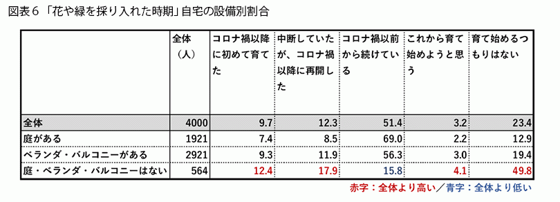 自宅にある設備を合わせて見ると(図表6)、「庭・ベランダ・バルコニーはない」人は、「育て始めるつもりはない」と回答した割合が49.8%(全体:23.4%)と非常に高く、「コロナ禍以前(2020年2月以前)から続けている」人の割合は15.8%(全体:51.4%)とかなり低いです。その裏返しか、「コロナ禍(2020年3月)以降に初めて育てた」「中断していたが、コロナ禍(2020年3月)以降に再開した」という割合は全体と比べて、多少高くなっています。