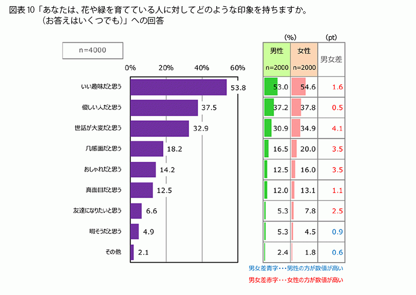 また、 花や緑を育てている人に対してどのような印象を持つかを聞いたところ(図表10)、1位が「いい趣味だと思う」(53.8%)、2位が「優しい人だと思う」(37.5%)でした。「几帳面だと思う」(18.2%)、「おしゃれだと思う」(14.2%)「真面目だと思う」(12.5%)と感じる人もそれなりにいるため、花や緑を育てることは相手にとってポジティブな印象を与える効果があると言えるでしょう。