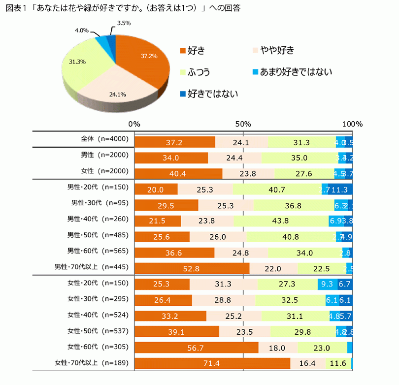 「育て始めるつもりはない」と回答した人の割合は若いほど高い傾向にありますが、「花や緑が好きか」という先程の質問では、高齢になるほど「好き」の割合が高くなる傾向にありました(図表1)。