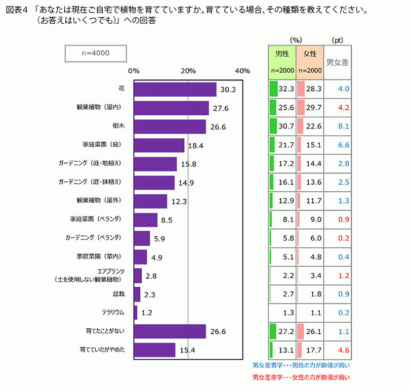 「育てたことがない」という人は26.6%、「育てていたがやめた」人が15.4%でした。残りの約58%の人たちは、現在、なんらかの植物を育てているということになりますが、興味深いのは多くの項目で女性より男性の割合が高くなっていることです。トップ3のなかでは、「花」は男性が4.0ポイント、「樹木」は8.1ポイント高くなっています。また、4位の「家庭菜園(庭)」も男性が6.6ポイント高いです。