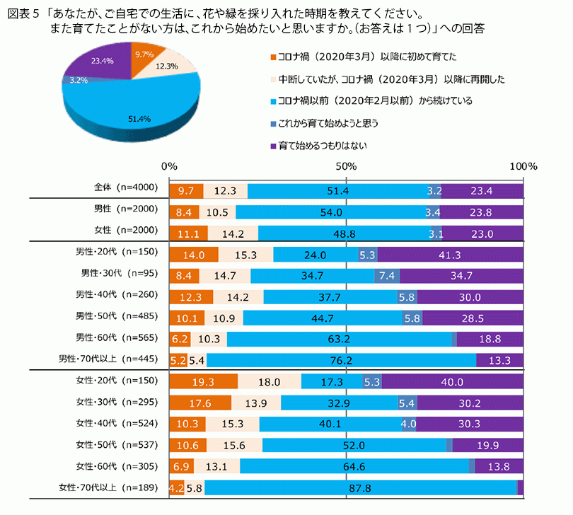 また、「コロナ禍(2020年3月)以降に初めて育てた」という人が9.7%、「中断していたが、コロナ禍(2020年3月)以降に再開した」という人が12.3%です。この2年で「初めて育てた」「再開した」人を合計すると2割を超えています。