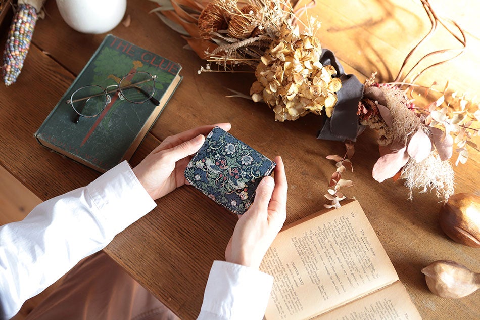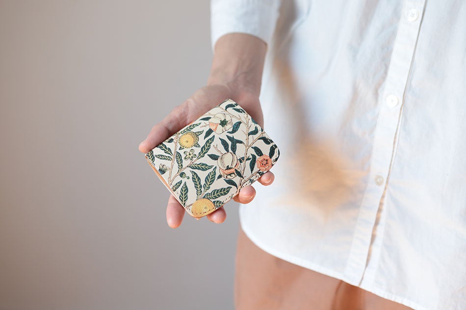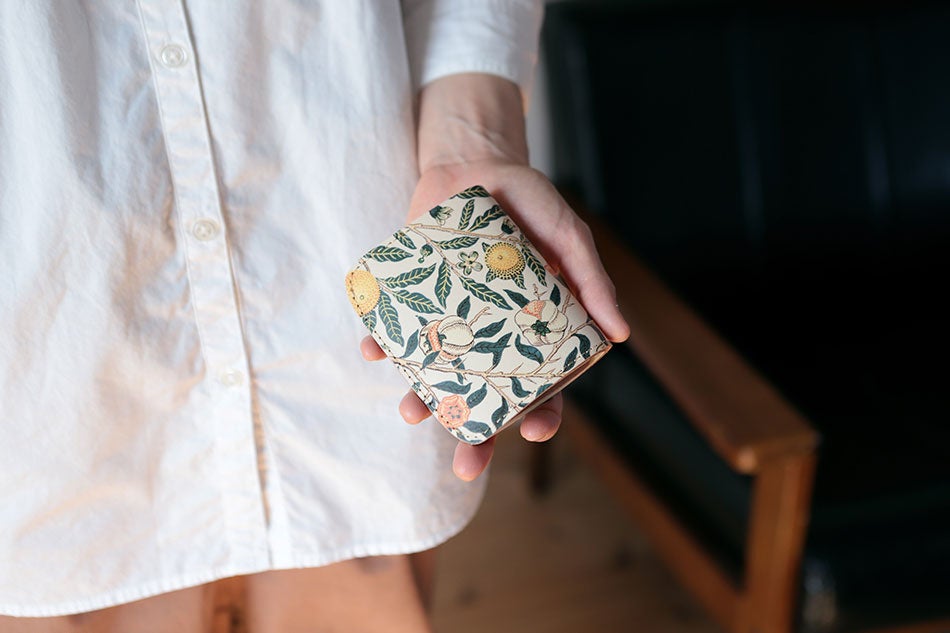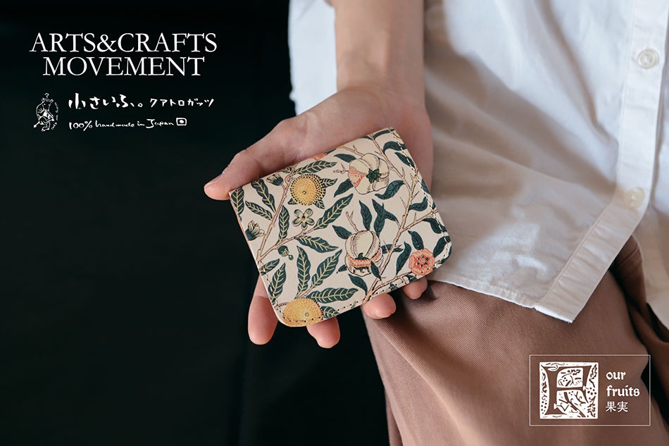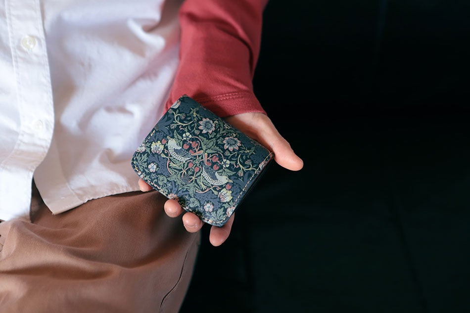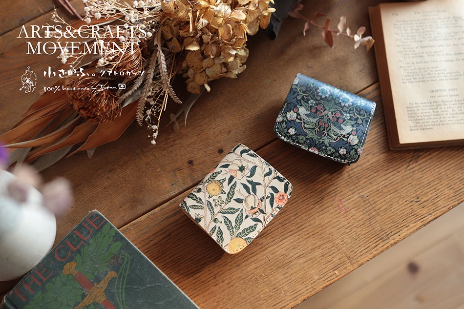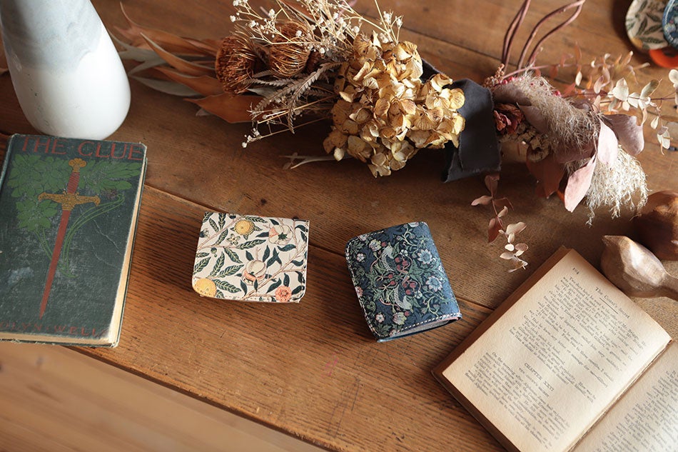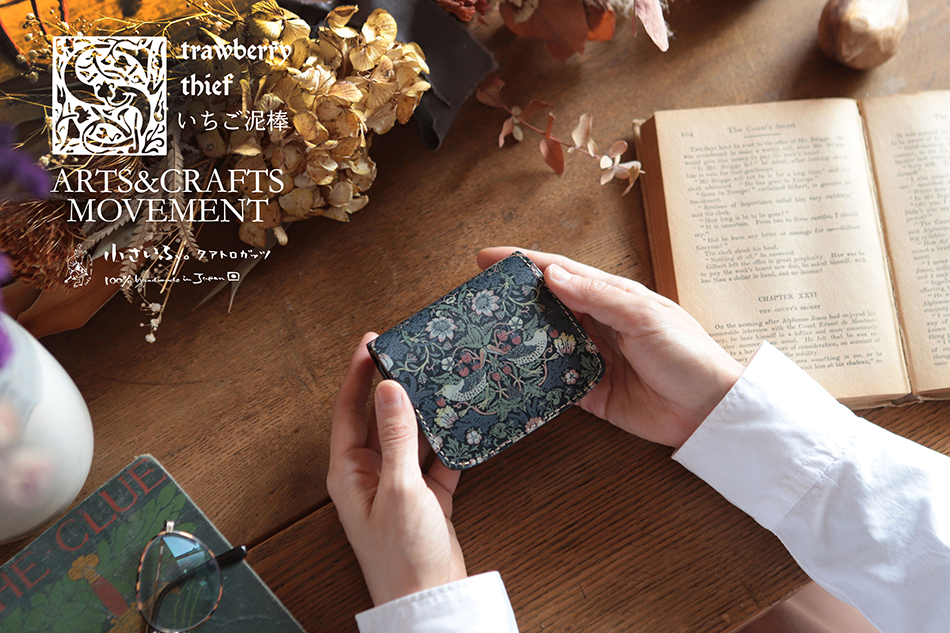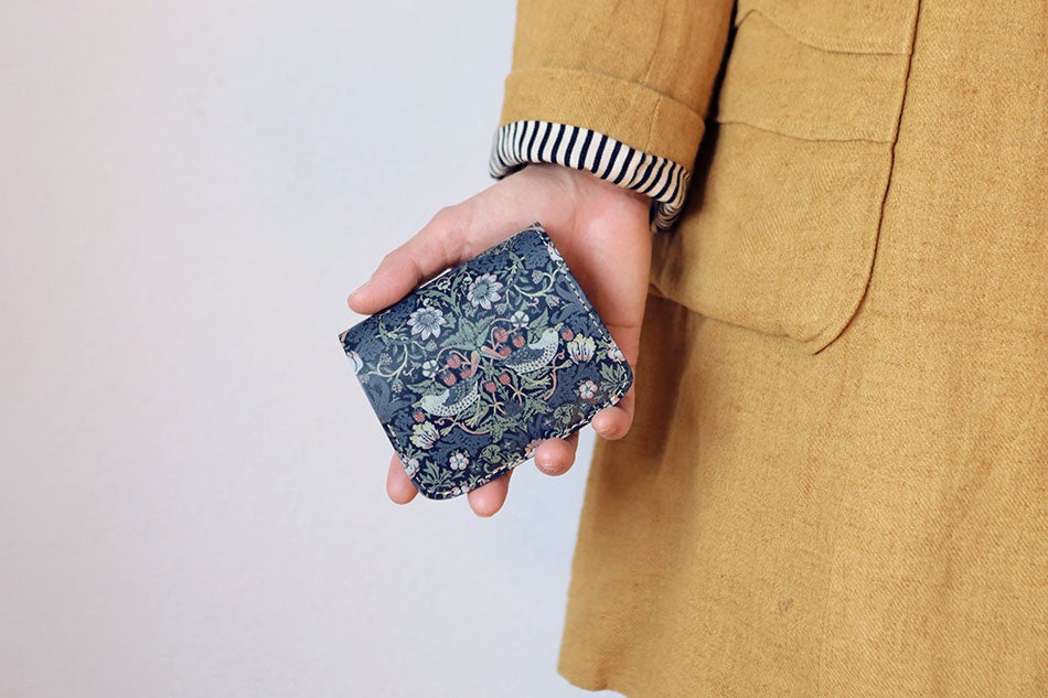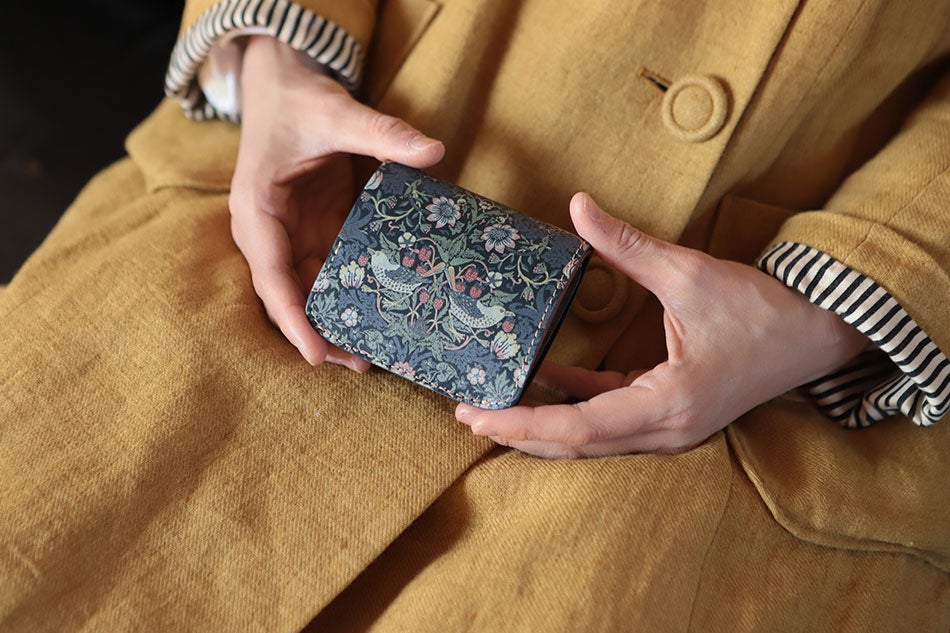 ウィリアム・モリスの「いちご泥棒」と「フルーツ」が手のひらサイズのミニ財布に!国産最高峰の栃木レザーと姫路レザーで革職人がすべてハンドメイド。