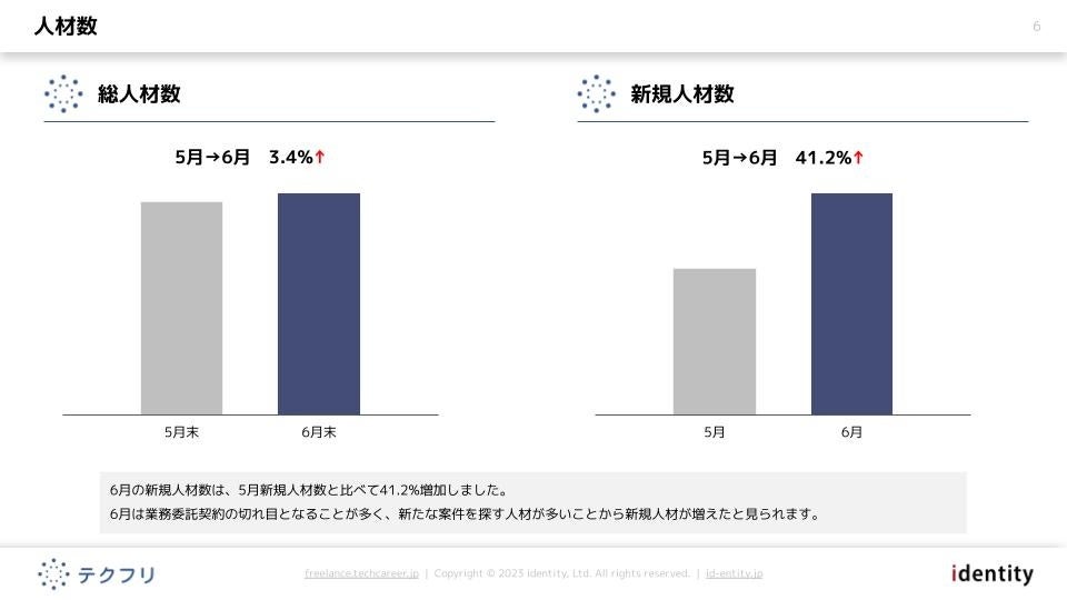 6月の新規人材数は、5月新規人材数と比べて41.2%増加しました。6月は業務委託契約の切れ目となることが多く、新たな案件を探す人材が多いことから新規人材が増えたと見られます。