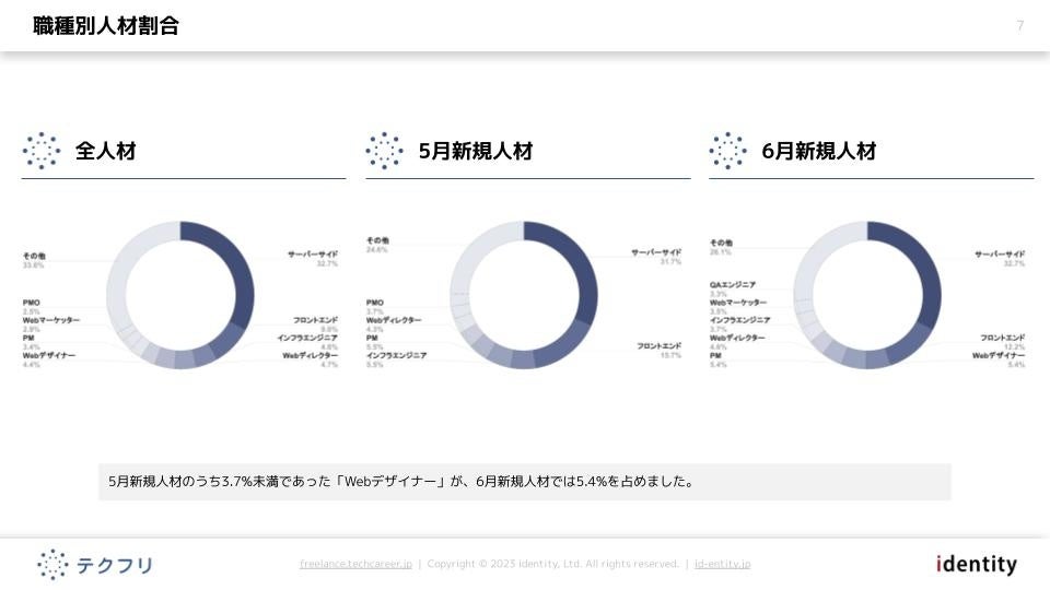・5月新規人材のうち3.7%未満であった「Webデザイナー」が、6月新規人材では5.4%を占めました。