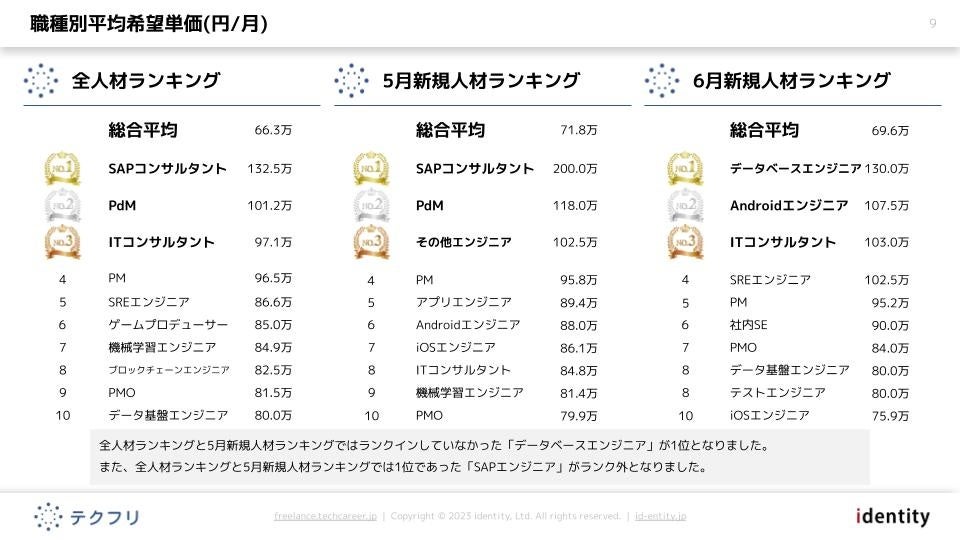 ・職種別平均希望単価において、全人材ランキングと5月新規人材ランキングではランクインしていなかった「データベースエンジニア」が1位となりました。