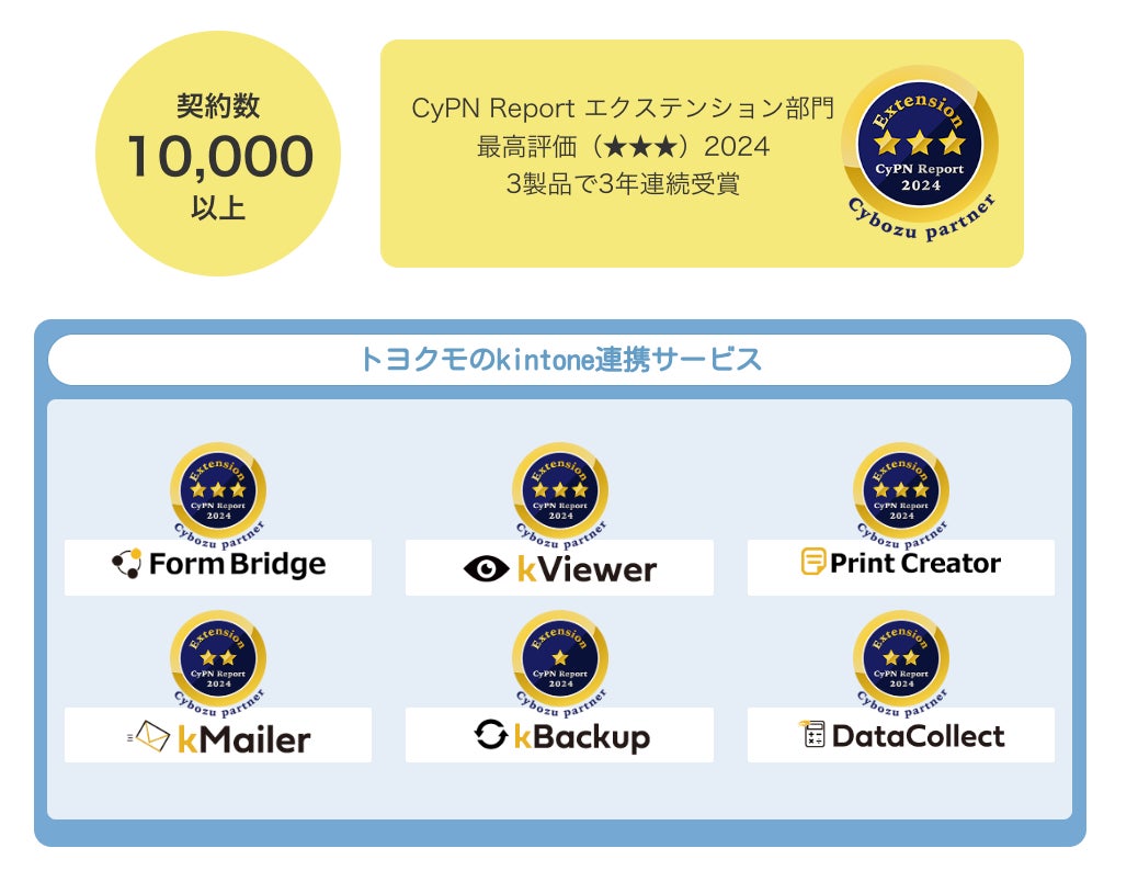 また、サイボウズが設定している評価基準「Cybozu Partner Network Report」にて、全てのkintone連携サービスで星評価を獲得しています。