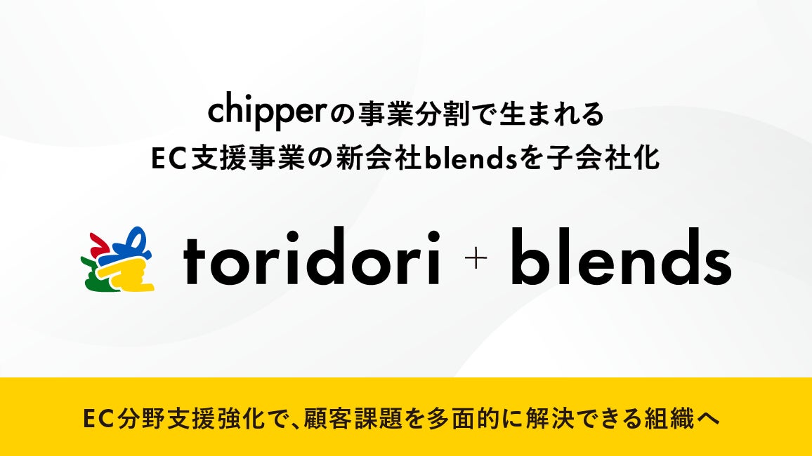 PR実績70万件のインフルエンサーマーケティングプラットフォーム『toridori marketing(トリドリマーケティング)』を中心に各種インフルエンス・プラットフォーム事業を展開する株式会社トリドリ(本社:東京都渋谷区、代表取締役社長CEO:中山貴之、証券コード:9337、以下toridori)は、2024年8月28日付の取締役会において、株式会社chipper(以下chipper)が提供するEC支援事業を新設分割して設立予定の新会社『株式会社blends(以下blends※2024年10月1日設立予定)』の株式を取得し、子会社化することを決定いたしました。