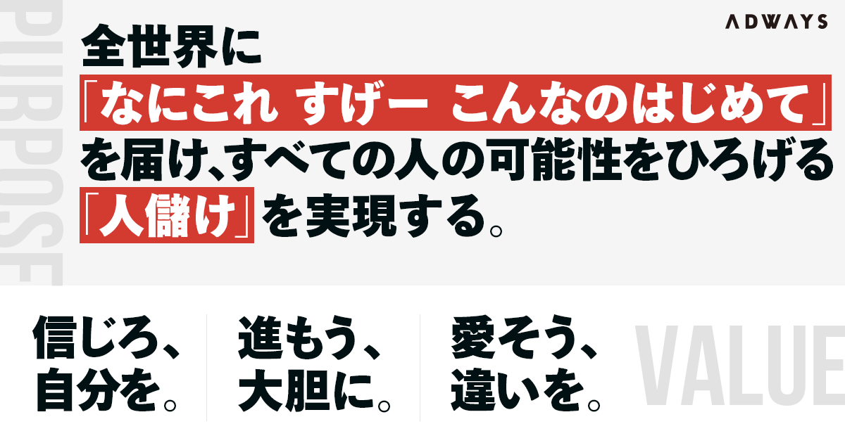 これまでなかった“なにこれ すげー こんなのはじめて”を、できるだけ多くの方々へ届け、すべての人が成長できる社会へ向け、アドウェイズは、事業を通じて本質的な価値を創造し、パーパスを実現してまいります。